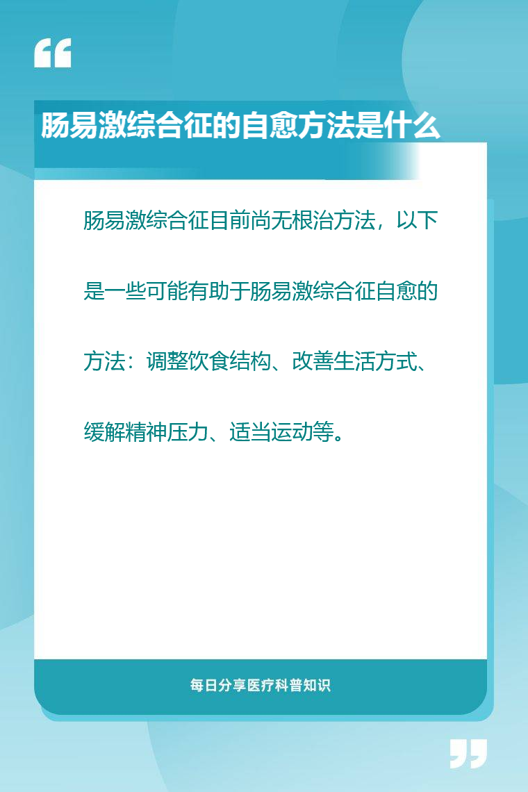 肠易激综合征目前尚无根治方法,以下是一些可能有助于肠易激综合征自愈的方法:调整饮食结构、改善生活方式、缓解精神压力、适当运动等。