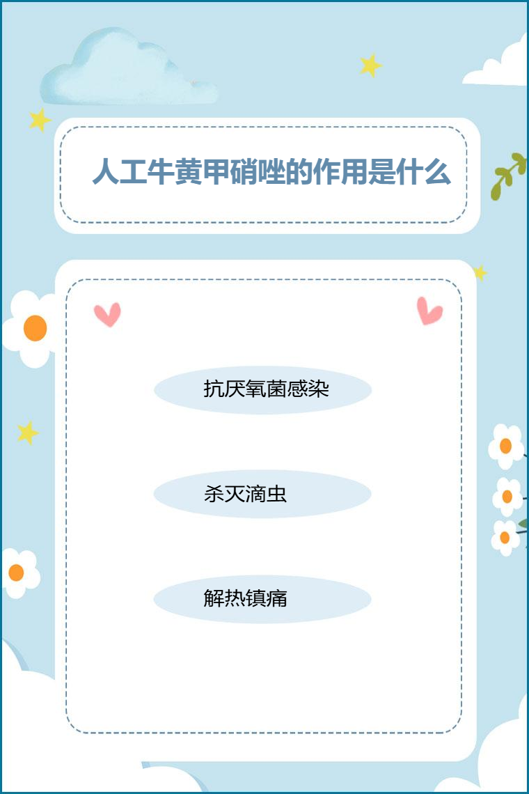 甲硝唑对阴道毛滴虫也有杀灭作用。人工牛黄甲硝唑在治疗滴虫性阴道炎等疾病时也可能会被使用。