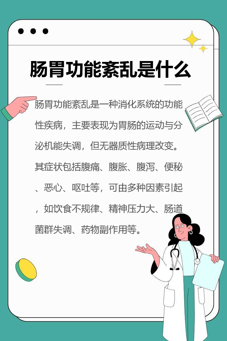 肠胃功能紊乱是一种消化系统的功能性疾病,主要表现为胃肠的运动与分泌机能失调,但无器质性病理改变。其症状包括腹痛、腹胀、腹泻、便秘、恶心、呕吐等,可由多种因素引起,如饮食不规律、精神压力大、肠道菌群失调、药物副作用等。以下是关于肠胃功能紊乱的一些常见类型: