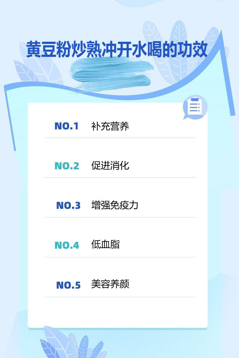 黄豆粉炒熟冲开水喝具有多种功效,如补充营养、促进消化、增强免疫力、低血脂、美容养颜等。