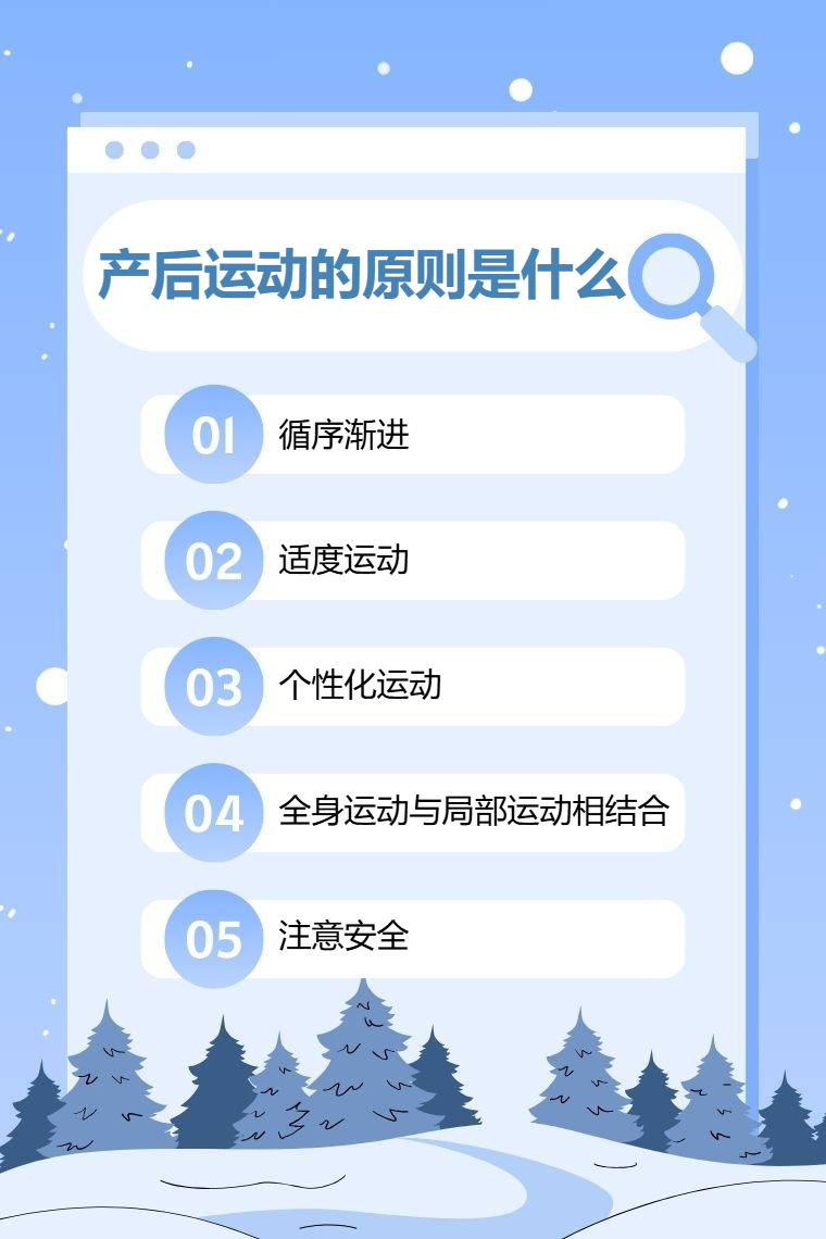 产后运动对于产妇的身体恢复和健康具有重要意义。产后运动的原则包括循序渐进、适度运动、个性化运动、全身运动与局部运动相结合、注意安全等。