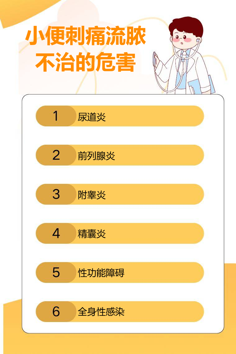 小便刺痛流脓不治的危害主要有尿道炎、前列腺炎、附睾炎、精囊炎、性功能障碍、全身性感染等。