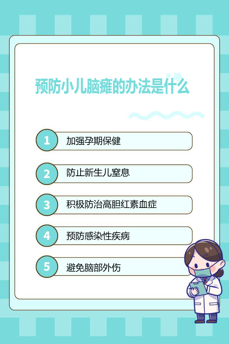 预防小儿脑瘫的办法包括加强孕期保健、防止新生儿窒息、积极防治高胆红素血症、预防感染性疾病、避免脑部外伤等。