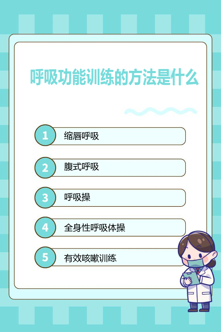 呼吸功能训练的方法包括缩唇呼吸、腹式呼吸、呼吸操、全身性呼吸体操、有效咳嗽训练等。