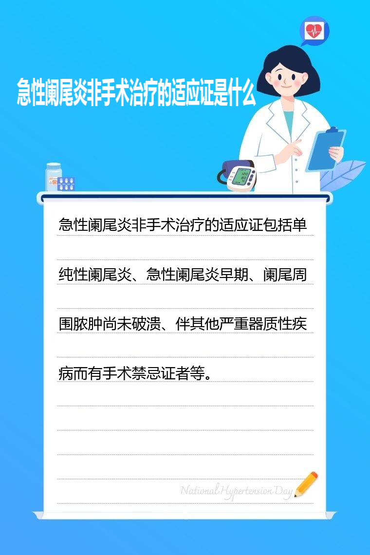 急性阑尾炎非手术治疗的适应证需要根据患者的具体情况进行综合判断。在治疗过程中,患者应密切配合医生的治疗,注意休息,调整饮食,以促进病情的恢复。如果病情恶化或出现并发症,应及时转为手术治疗。