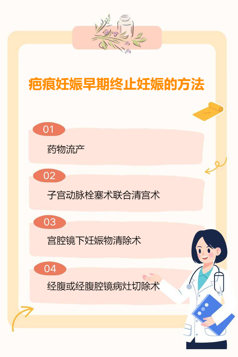 疤痕妊娠是一种较为危险的情况,早期终止妊娠的方法有多种,如药物流产、子宫动脉栓塞术联合清宫术、宫腔镜下妊娠物清除术、经腹或经腹腔镜病灶切除术等。