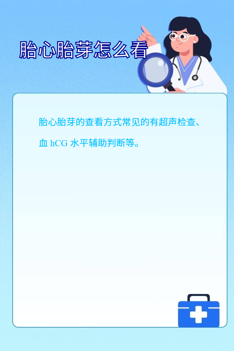 胎心胎芽的查看方式常见的有超声检查、血 hCG 水平辅助判断等。