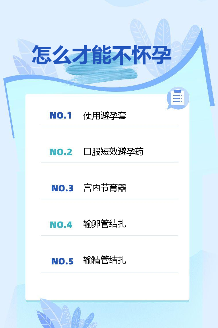 常见的避免怀孕的方式有使用避孕套、口服短效避孕药、宫内节育器等,较罕见的有输卵管结扎、输精管结扎等。
