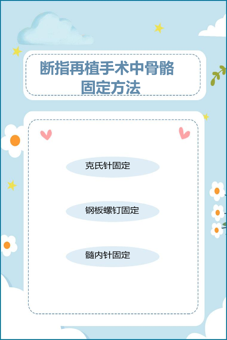断指再植手术中骨骼固定方法主要有克氏针固定、钢板螺钉固定、髓内针固定等。