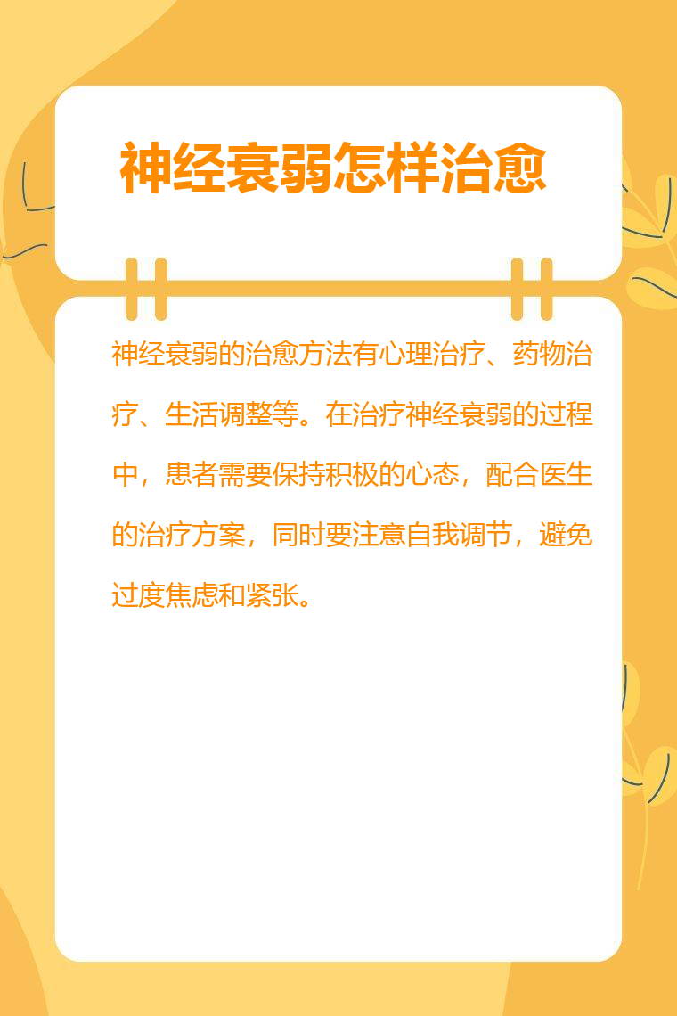 神经衰弱的治愈方法有心理治疗、药物治疗、生活调整等。以下是具体介绍: