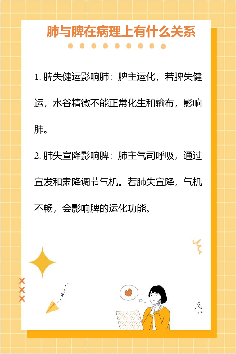肺与脾在病理上的关系常见的有脾失健运影响肺、肺失宣降影响脾等。
