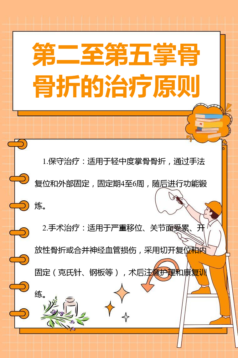 第二至第五掌骨骨折的治疗原则主要有保守治疗、手术治疗等。