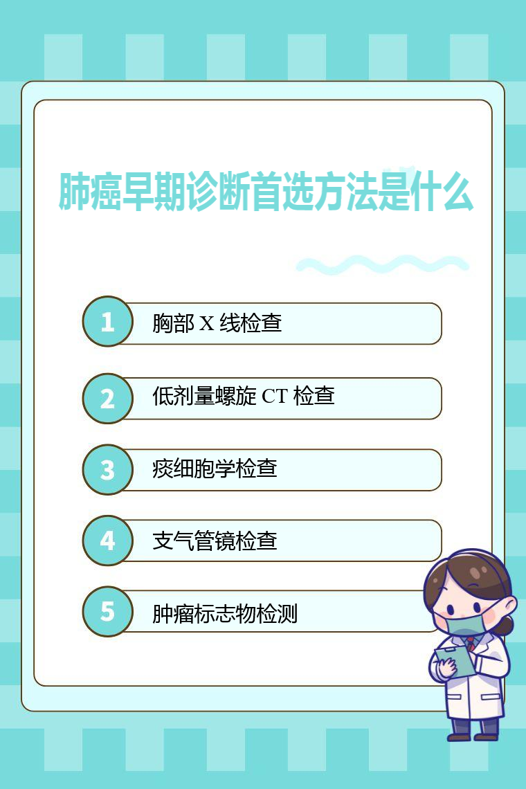 肺癌是一种常见的恶性肿瘤,早期诊断对于提高治疗效果和生存率至关重要。肺癌早期诊断的首选方法包括胸部 X 线检查、低剂量螺旋 CT 检查、痰细胞学检查、支气管镜检查、肿瘤标志物检测等。