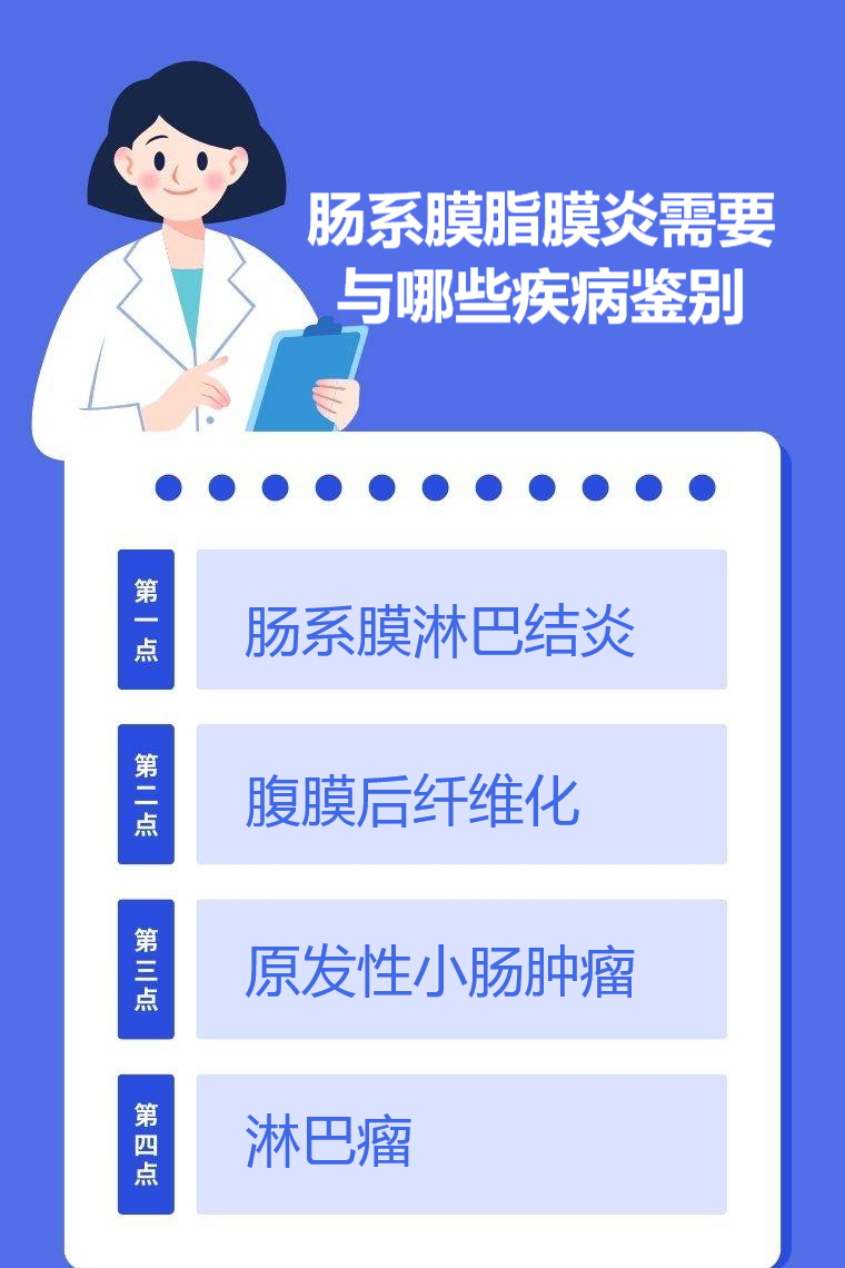 肠系膜脂膜炎需要与肠系膜淋巴结炎、腹膜后纤维化、原发性小肠肿瘤、淋巴瘤等疾病进行鉴别。