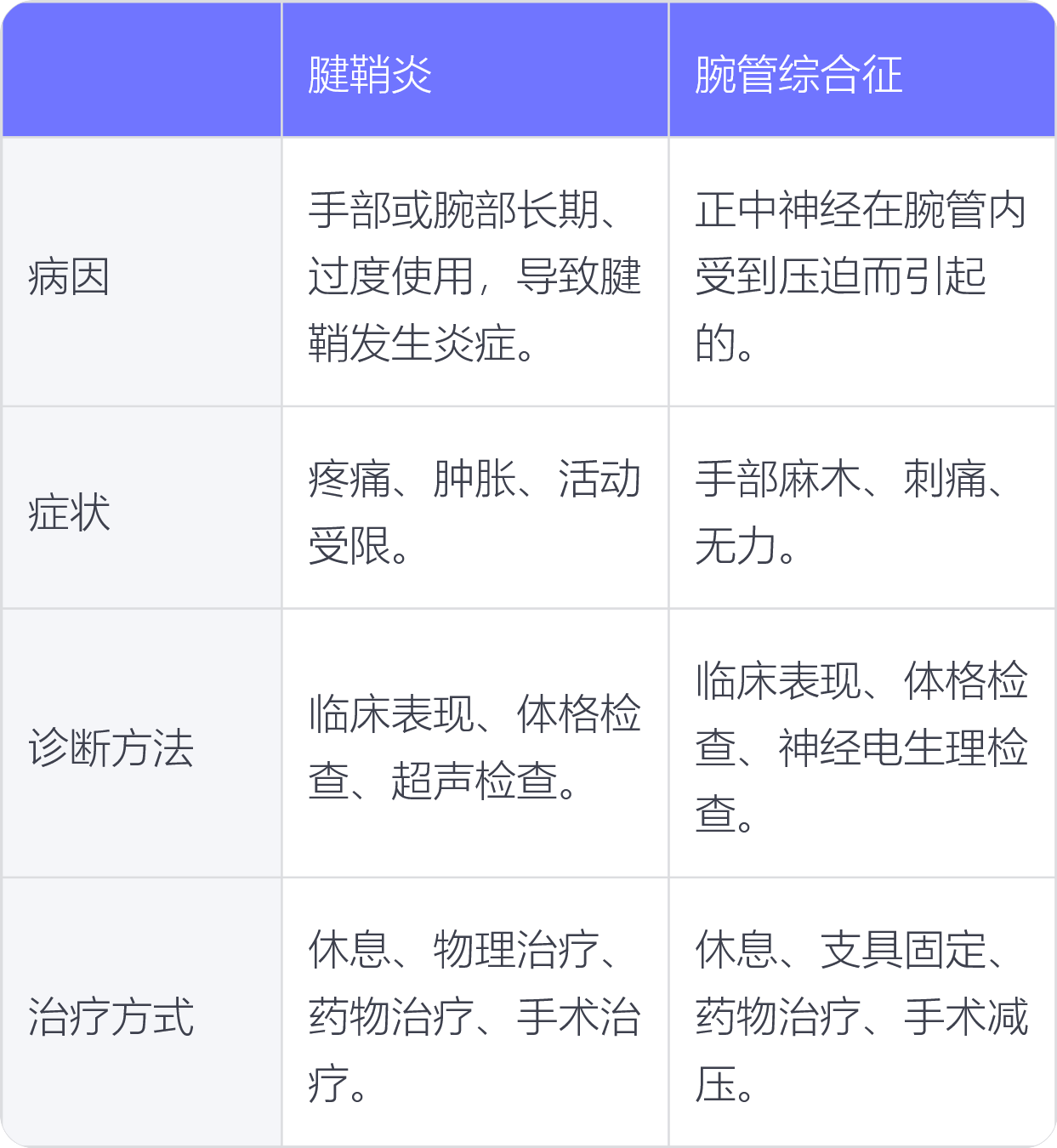 无论是腱鞘炎还是腕管综合征,患者在日常生活中都应注意避免过度使用手部和腕部,注意休息。如果出现相关症状,应及时就医,以便进行准确的诊断和治疗。
