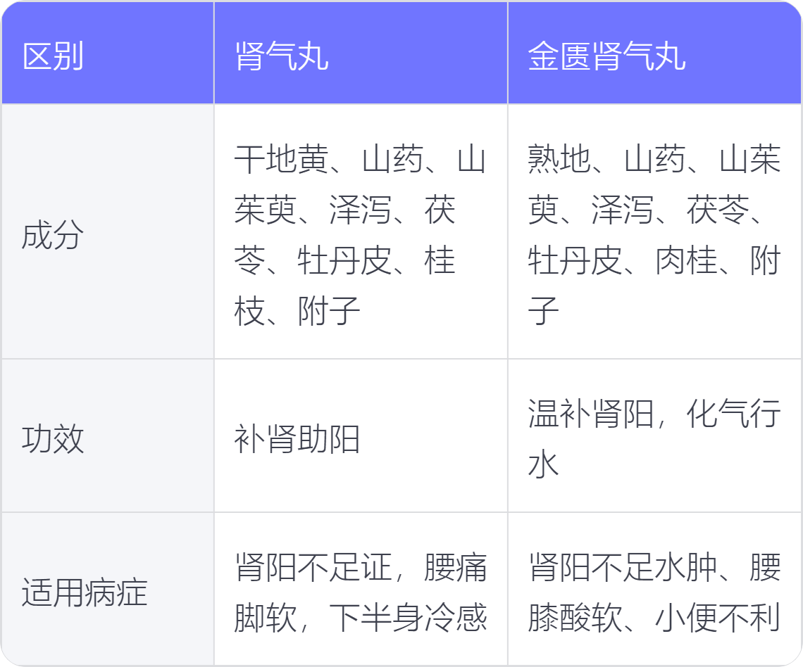 3.适用病症:肾气丸适用于肾阳不足证,症见腰痛脚软,下半身常有冷感等。金匮肾气丸常用于肾阳不足所致的水肿、腰膝酸软、小便不利等病症。