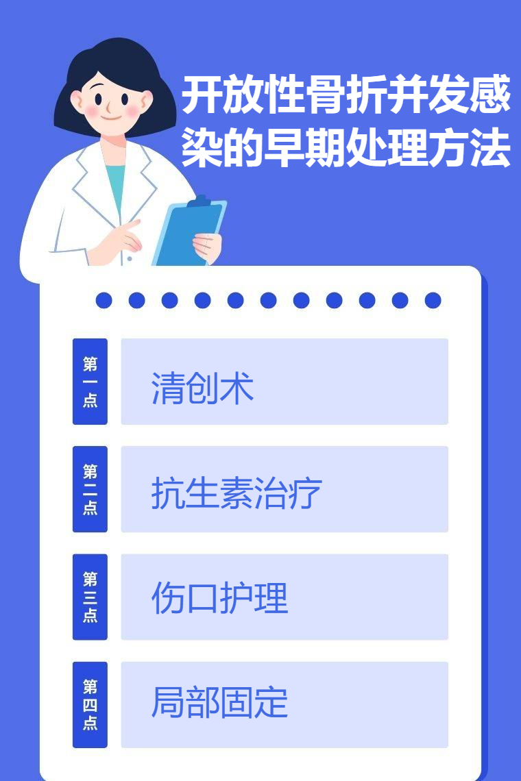 开放性骨折并发感染的早期处理方法主要包括清创术、抗生素治疗、伤口护理及局部固定等。