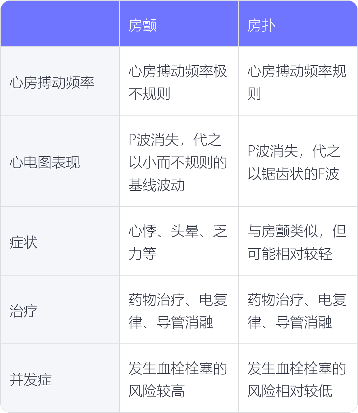 房颤和房扑都是常见的心律失常,在心房搏动频率、心电图表现、症状、治疗、并发症等方面有区别。