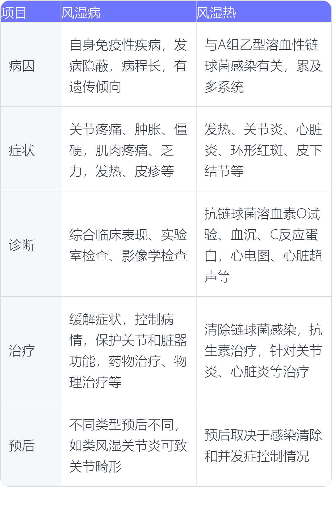 风湿病和风湿热是两种不同的疾病,它们在病因、症状、诊断和治疗等方面存在一些区别: