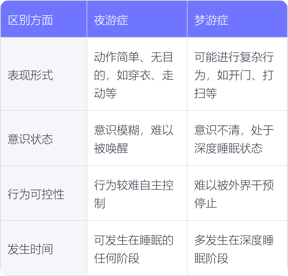 3. 行为可控性:夜游症行为较难自主控制。梦游症通常难以被外界干预停止。