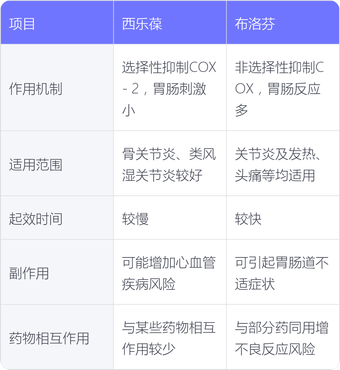 1.作用机制:西乐葆属于选择性 COX-2 抑制剂,主要抑制环氧化酶-2,对胃肠道的刺激性相对较小;布洛芬属于非选择性 COX 抑制剂,对环氧化酶-1 和环氧化酶-2 都有抑制作用,胃肠道不良反应相对较多。