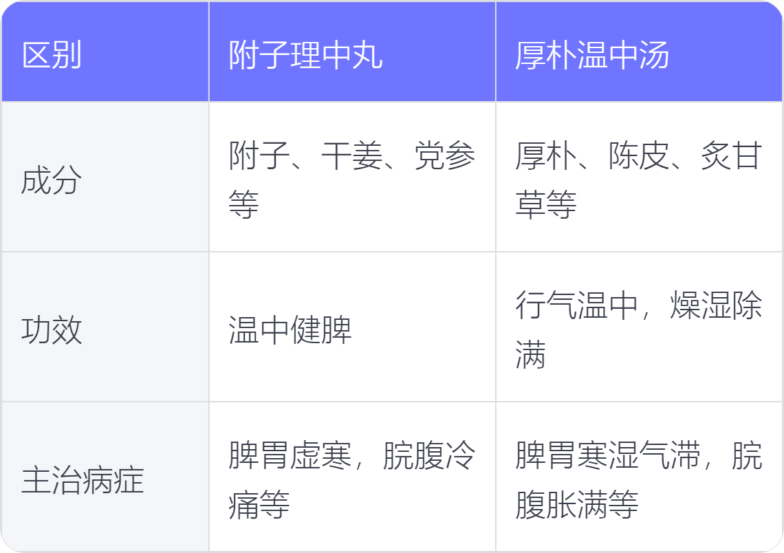 2.功效:附子理中丸具有温中健脾的作用;厚朴温中汤具有行气温中,燥湿除满的功效。