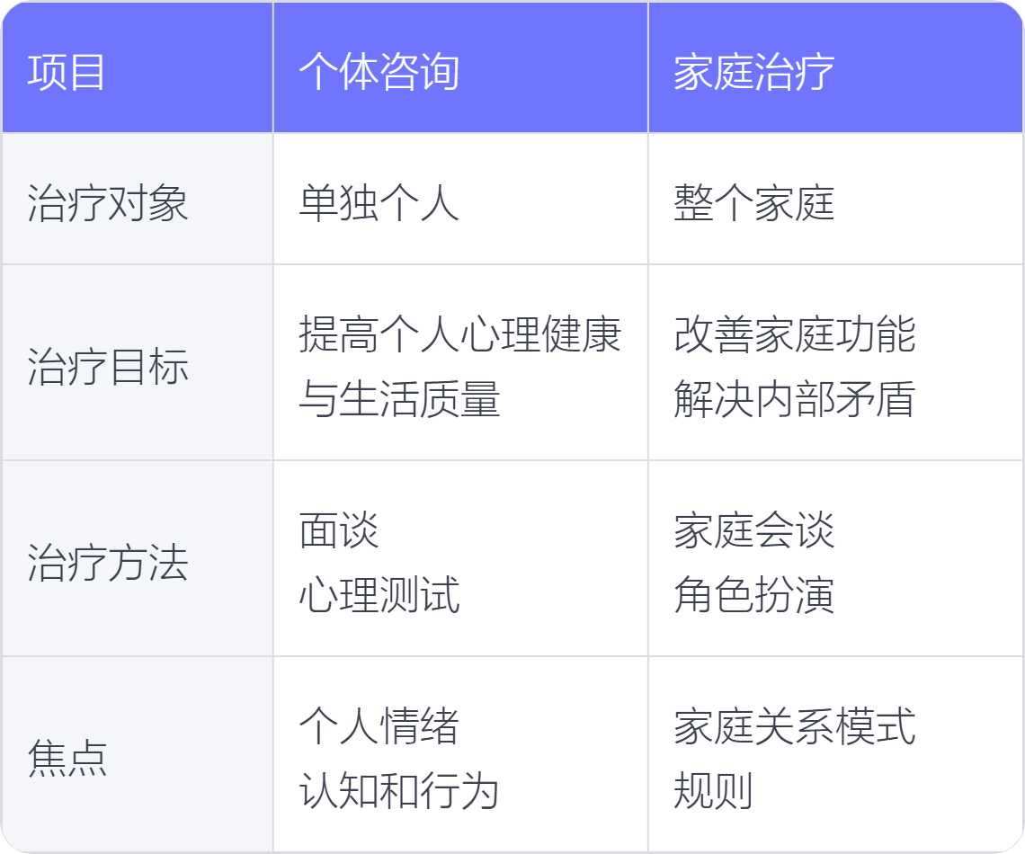 个体咨询是针对单独的个人,关注个人的内心世界、情感、思维和行为模式。家庭治疗是以整个家庭为治疗对象,关注家庭成员之间的关系、互动模式和沟通方式。