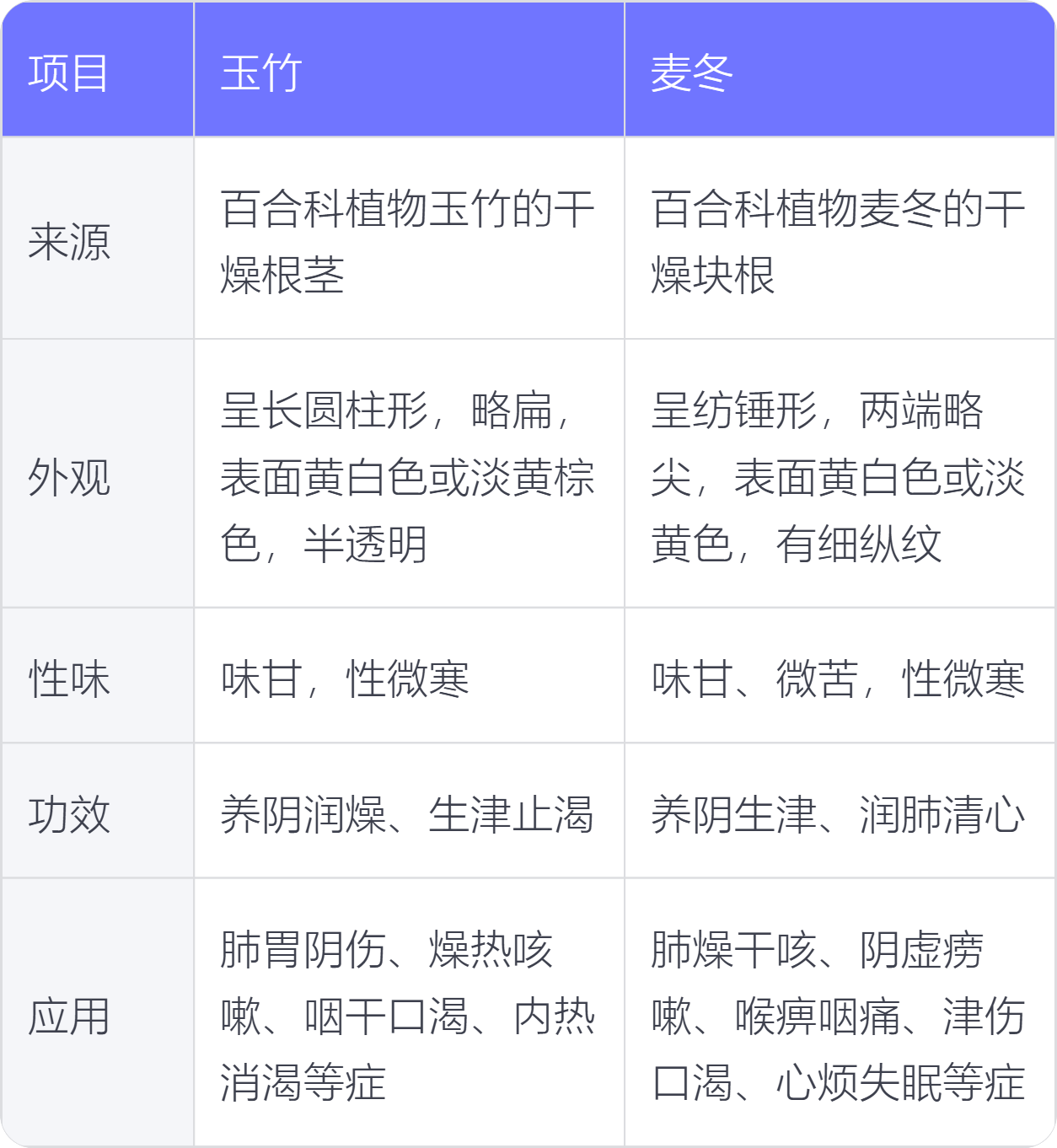 4.功效:玉竹具有养阴润燥、生津止渴的功效;麦冬具有养阴生津、润肺清心的功效。