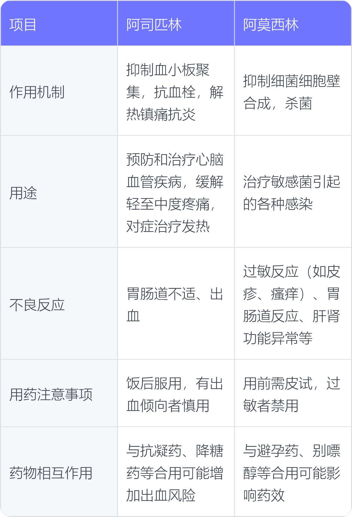 4.用药注意事项:阿司匹林对胃肠道有刺激作用,应饭后服用,有出血倾向者慎用。阿莫西林用前需进行皮试,过敏者禁用。