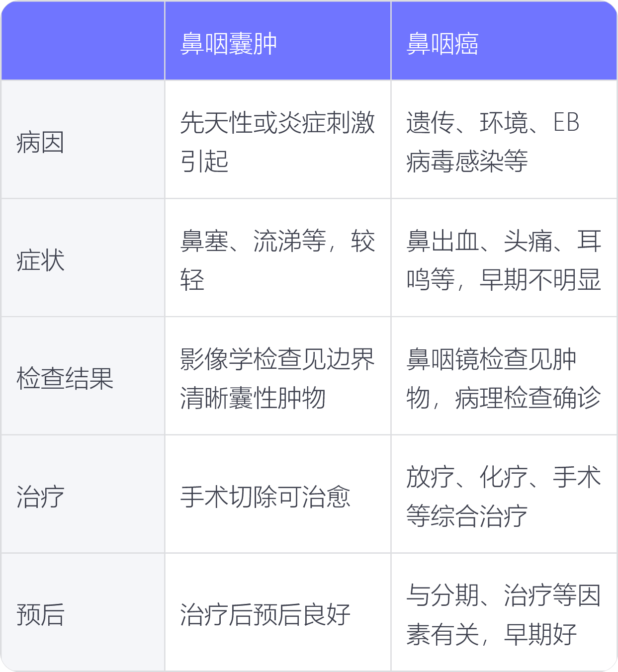 鼻咽囊肿和鼻咽癌是两种不同的疾病,在多个方面存在区别: