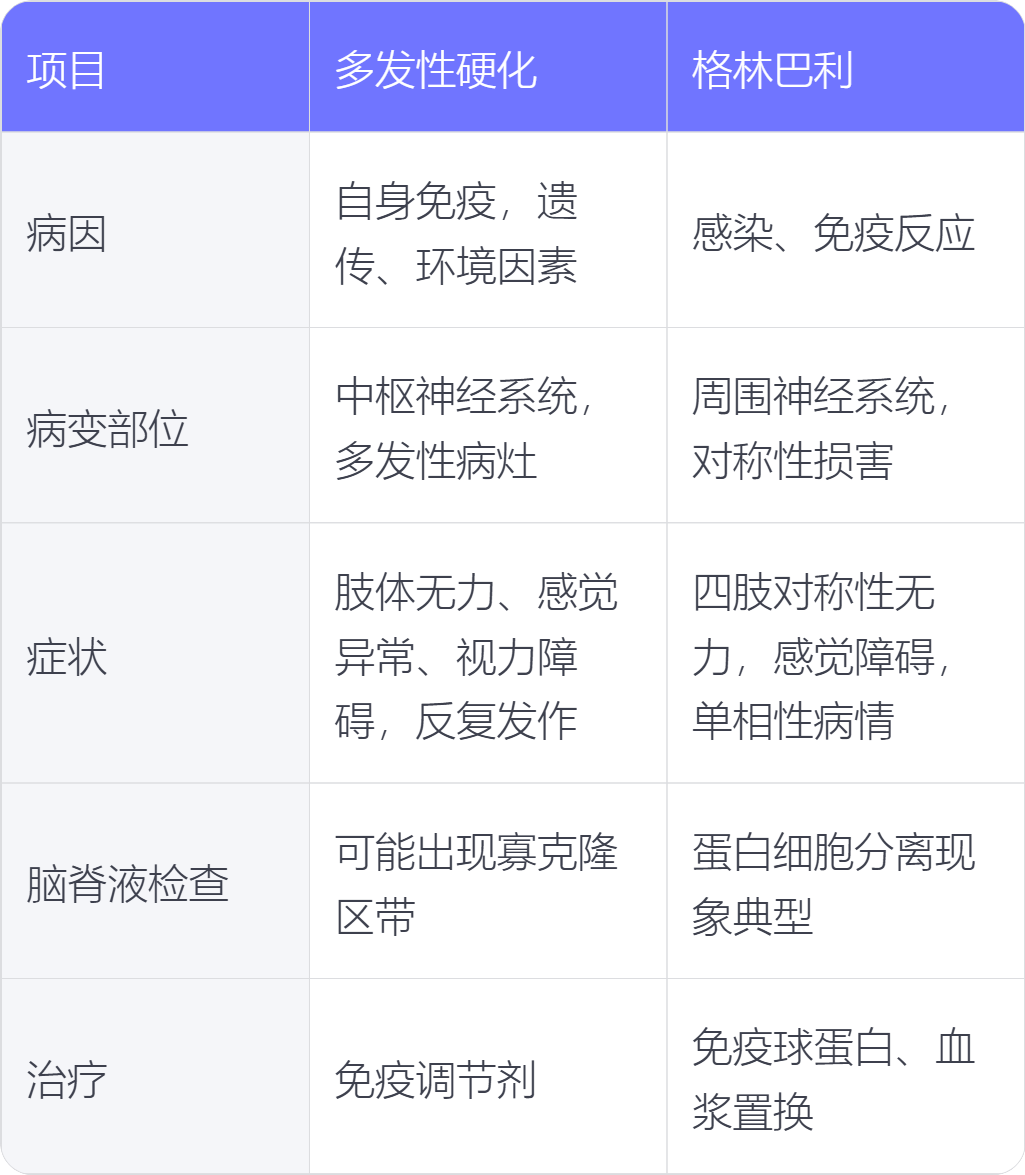 2.病变部位:多发性硬化主要累及中枢神经系统,病灶呈多发性;格林巴利主要影响周围神经系统,多为对称性损害。