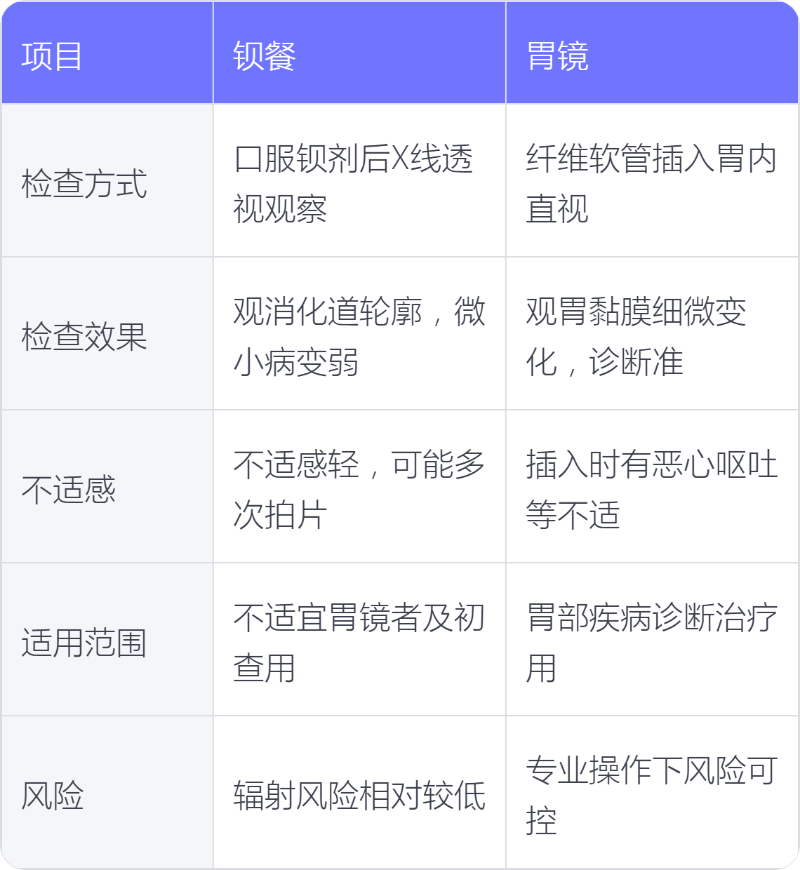 5.风险:钡餐检查的辐射风险相对较低;胃镜检查虽然是侵入性操作,但在专业医生的操作下风险通常可控,极少数情况下可能会出现出血、穿孔等并发症。