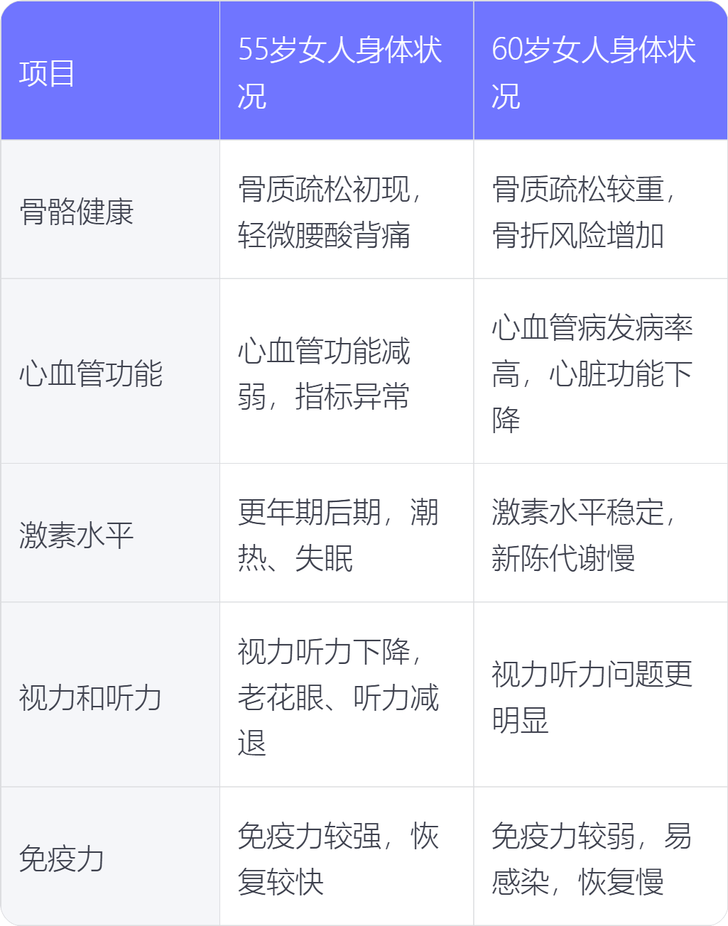 55岁女人和60岁女人的身体状况可能存在一些区别,主要体现在骨骼健康、心血管功能、激素水平、视力和听力、免疫力等方面。