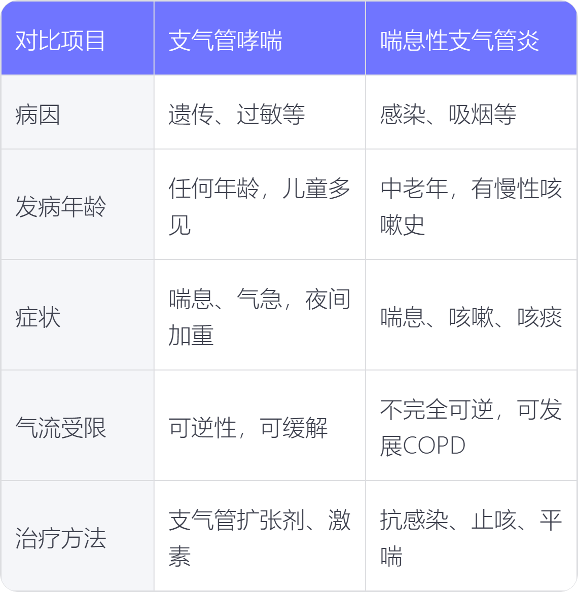 支气管哮喘和喘息性支气管炎在病因、发病年龄、症状、气流受限、治疗方法等方面存在区别。