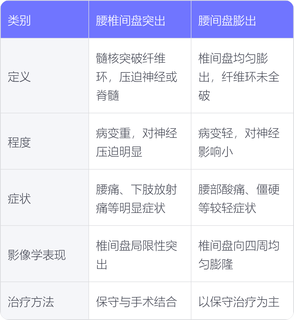 1.定义:腰椎间盘突出是指椎间盘的髓核突破纤维环,压迫神经根或脊髓,引起一系列症状;腰间盘膨出则是椎间盘向周围均匀膨出,纤维环没有完全破裂,一般症状相对较轻。