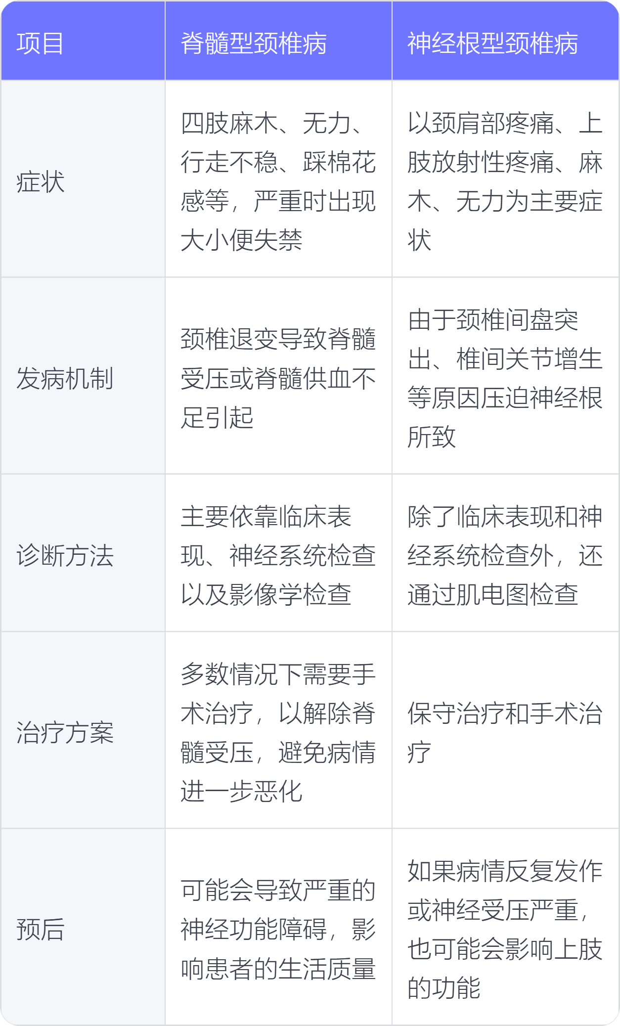 脊髓型颈椎病和神经根型颈椎病是颈椎病的两种常见类型,在症状、发病机制、诊断方法、治疗方案、预后等方面存在一些区别。