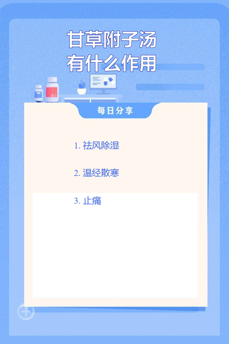 甘草附子汤具有祛风除湿、温经散寒、止痛等作用,可用于风湿相搏、骨节疼烦、掣痛不得屈伸、近之则痛剧、汗出短气、小便不利、恶风不欲去衣或身微肿等。
