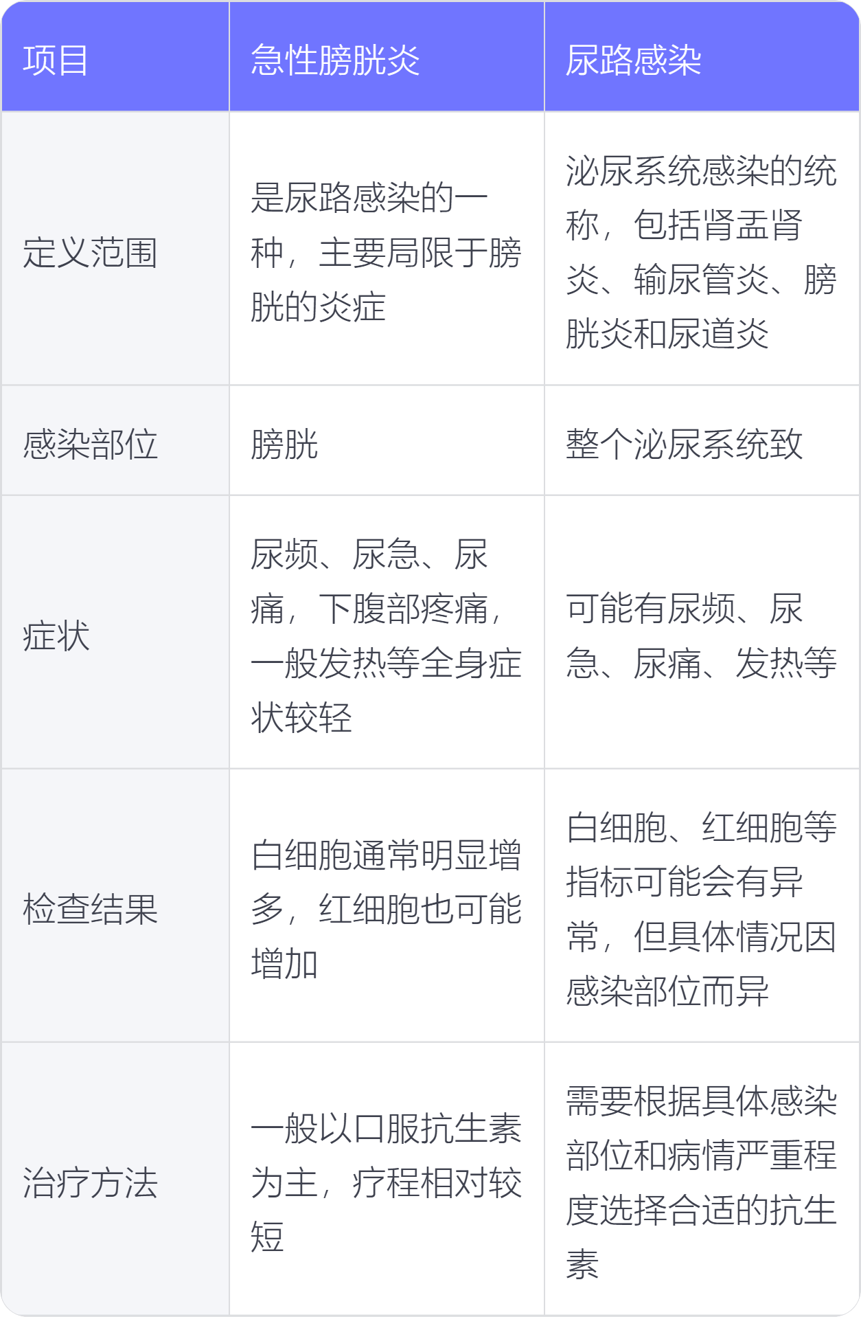 1.定义范围:急性膀胱炎是尿路感染的一种,主要局限于膀胱的炎症。尿路感染是泌尿系统感染的统称,包括肾盂肾炎、输尿管炎、膀胱炎和尿道炎等。