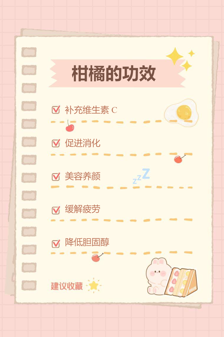 柑橘具有丰富的营养价值,具有补充维生素 C、促进消化、美容养颜、缓解疲劳、降低胆固醇等作用。