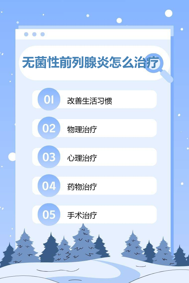 无菌性前列腺炎的治疗方法主要包括以下5项:改善生活习惯、物理治疗、心理治疗、药物治疗以及手术治疗等。