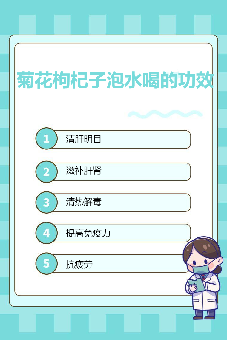 菊花、枸杞子泡水喝具有清肝明目、滋补肝肾、清热解毒、提高免疫力、抗疲劳等功效。