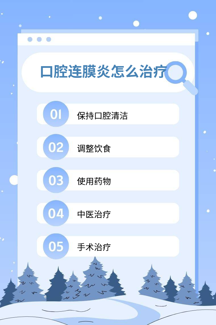 口腔连膜炎的治疗方法包括保持口腔清洁、调整饮食、使用药物、中医治疗以及在必要时进行手术治疗等。