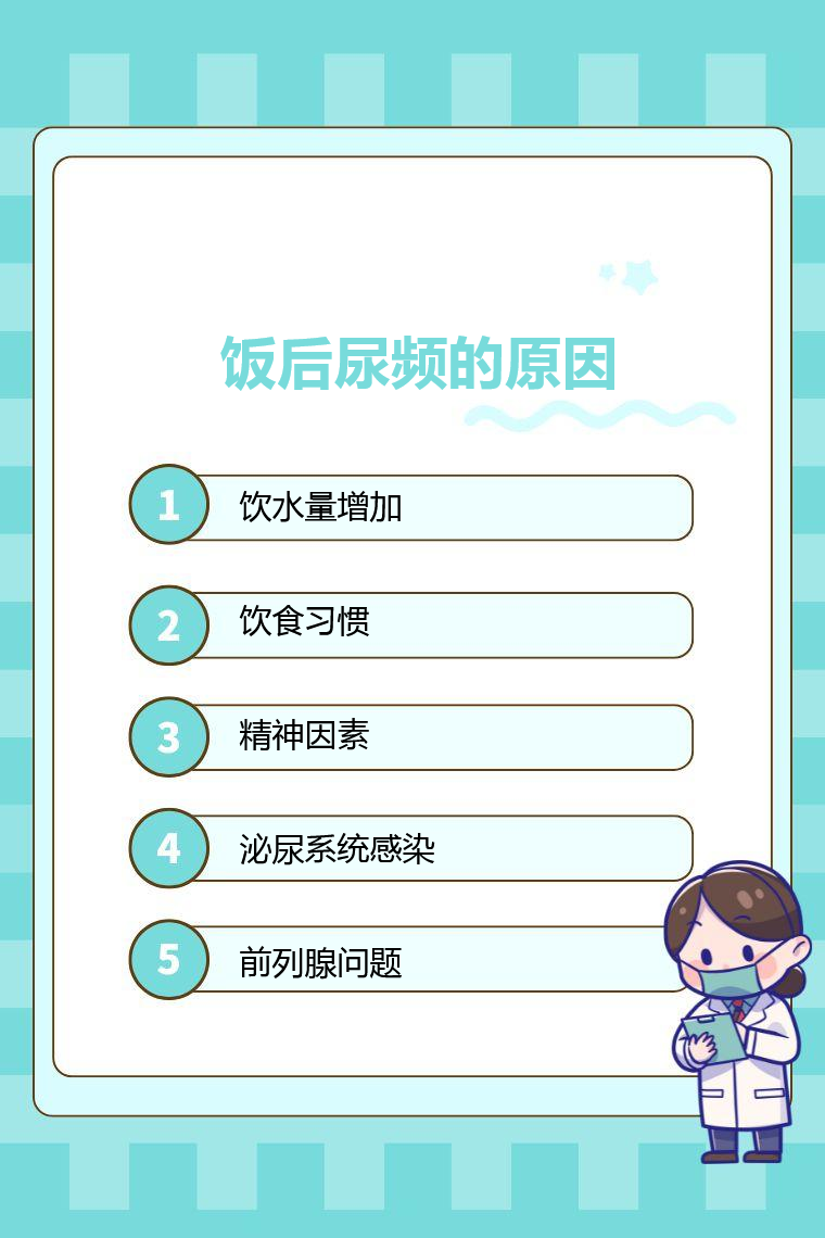 饭后尿频可能由多种原因引起,如饮水量增加、饮食习惯、精神因素、泌尿系统感染、前列腺问题等。