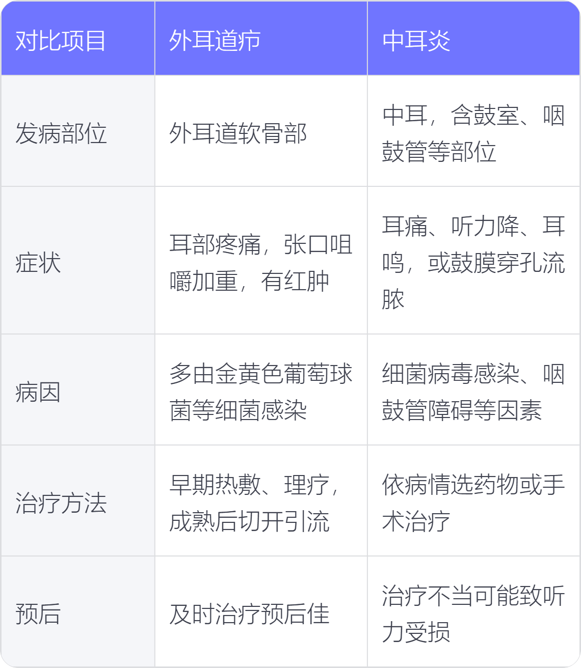 外耳道疖和中耳炎是两种不同的耳部疾病,它们在发病部位、症状、病因、治疗方法以及预后等方面存在一些区别。