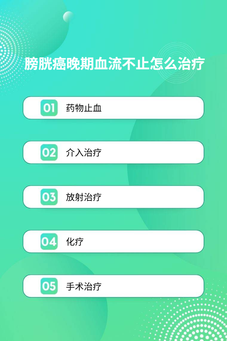 膀胱癌晚期血流不止可通过药物止血、介入治疗、放射治疗、化疗、手术治疗等方法进行治疗。
