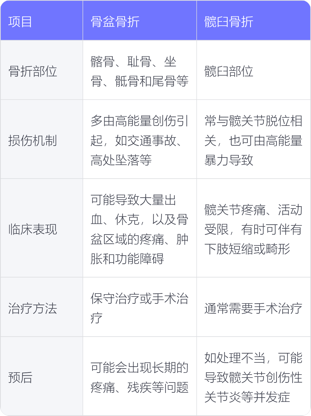 4.治疗方法:骨盆骨折的治疗根据骨折的稳定性和患者的整体情况选择保守治疗或手术治疗;髋臼骨折通常需要手术治疗,以恢复髋臼的解剖结构和髋关节的功能。