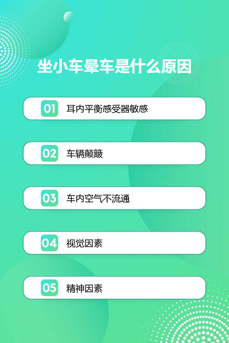 4. 视觉因素:乘车时如果眼睛看到的景象与身体感受到的运动不一致,比如在车上看书或看手机,可能会导致晕车。乘车时尽量避免看书、看手机等,注视前方道路。