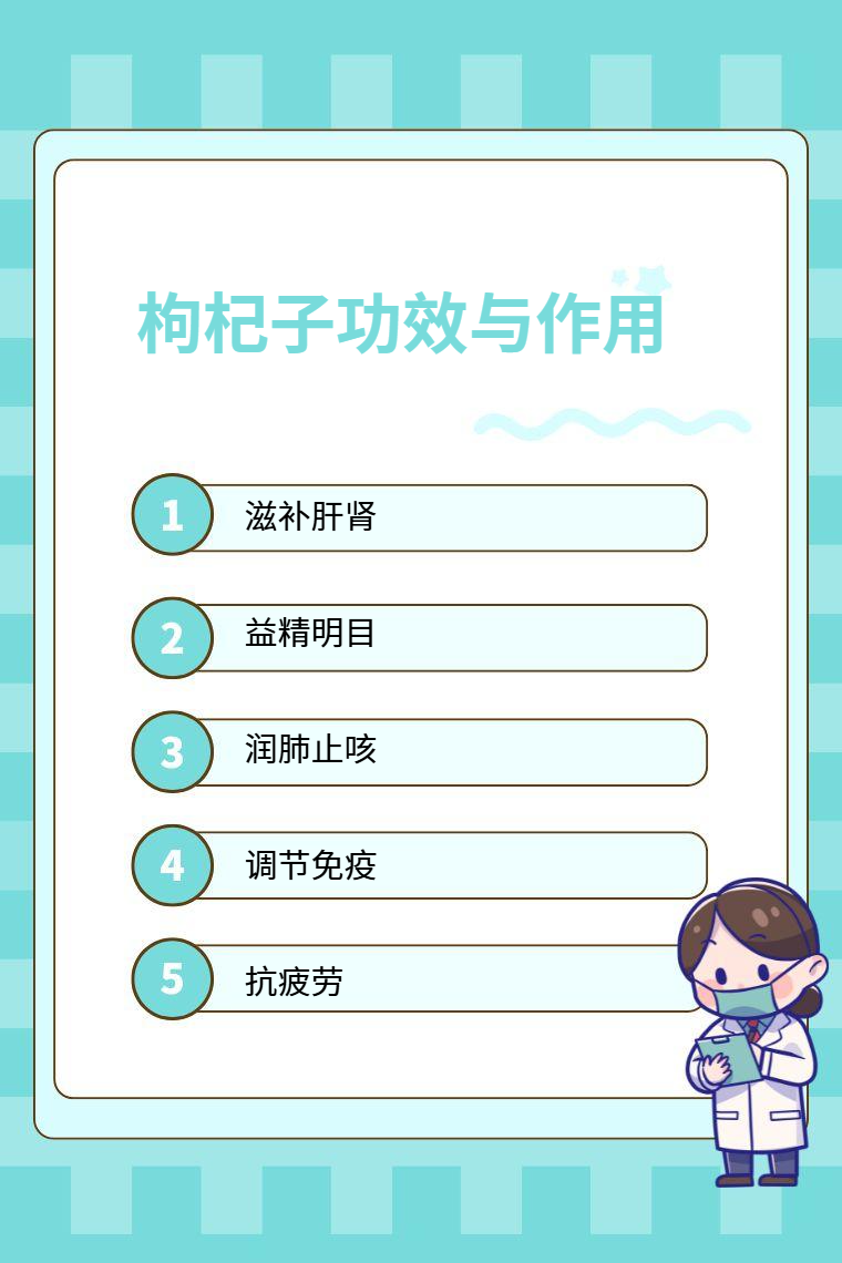 4.调节免疫:枸杞子中含有多种营养成分,如枸杞多糖、甜菜碱、维生素等,这些成分具有调节免疫功能的作用,能够增强机体的抵抗力,预防疾病的发生。