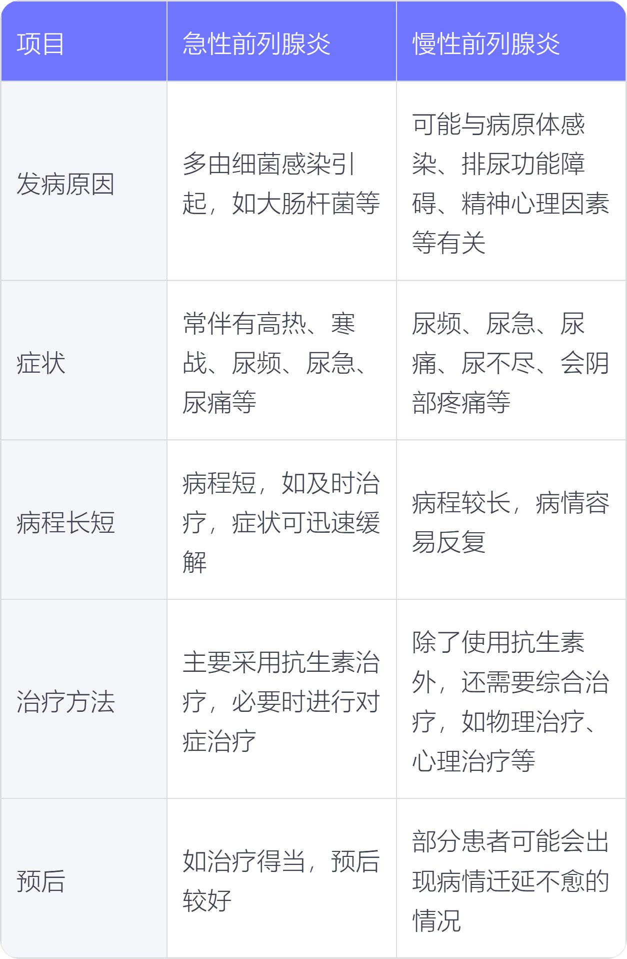急性前列腺炎和慢性前列腺炎在发病原因、症状、病程长短、治疗方法、预后等方面存在区别。
