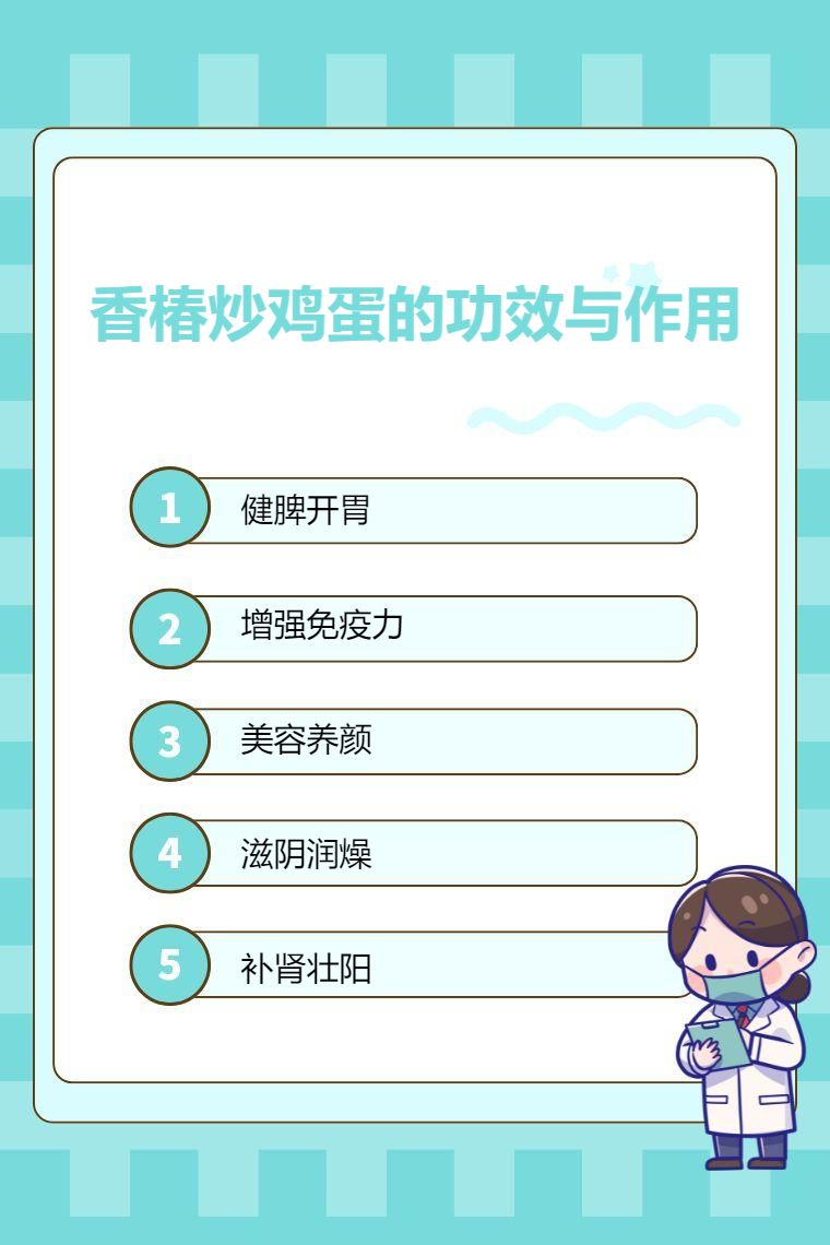 1.健脾开胃:香椿中含有丰富的挥发性芳香族有机物,有助于增加食欲,促进消化。鸡蛋中的蛋白质和脂肪也能够为身体提供能量,增强体力。食用香椿炒鸡蛋可以改善脾胃功能,缓解食欲不振、消化不良等症状。